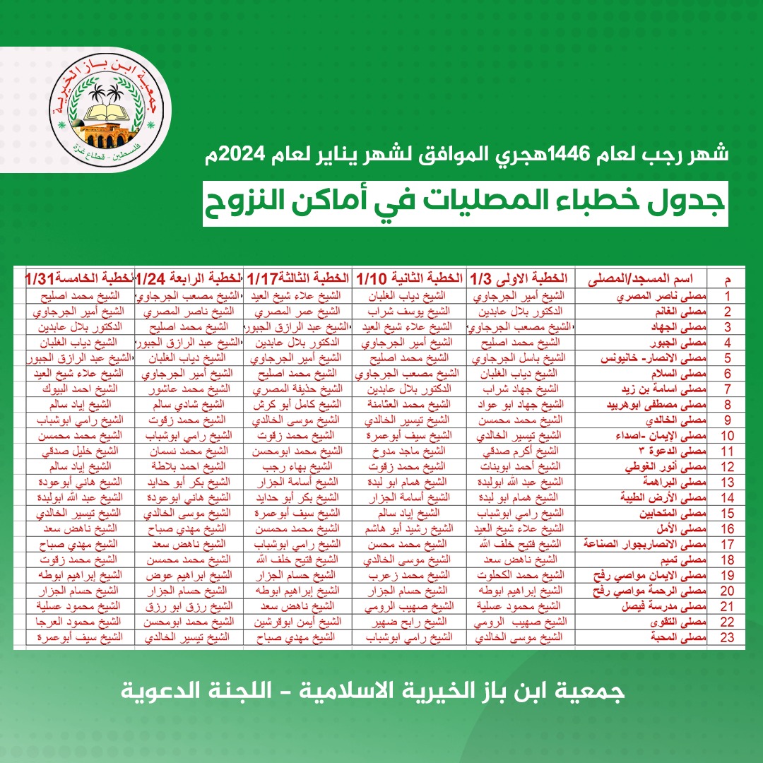 جدول خطباء الجمعة في مصليات النزوح جنوب غزة